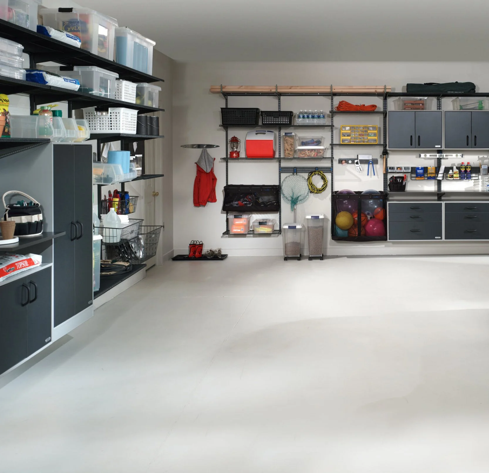 Organized garage with shelves holding storage bins, tools, and sports equipment.