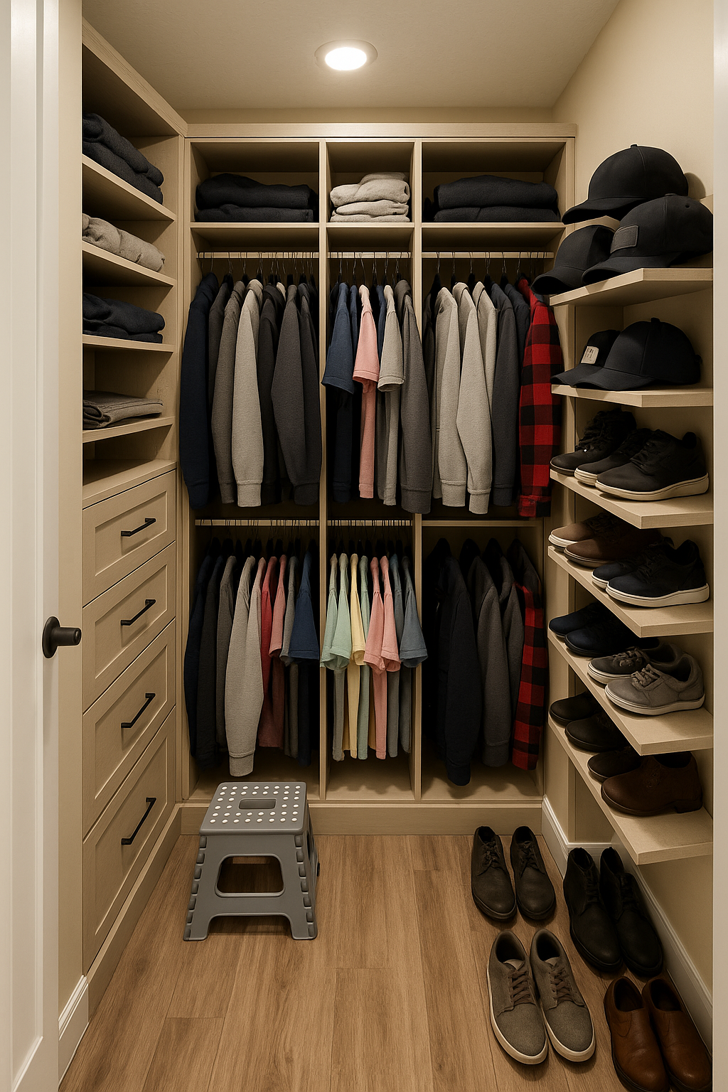 Organized closet with hanging shirts, folded clothes on shelves, and shoes on shelves and floor.
