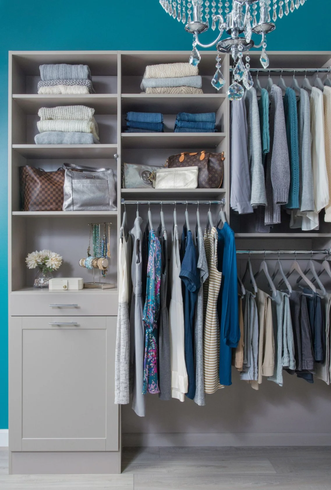 Organized closet with folded sweaters, handbags, hanging clothes, jewelry, and accessories against a teal wall with a chandelier overhead.