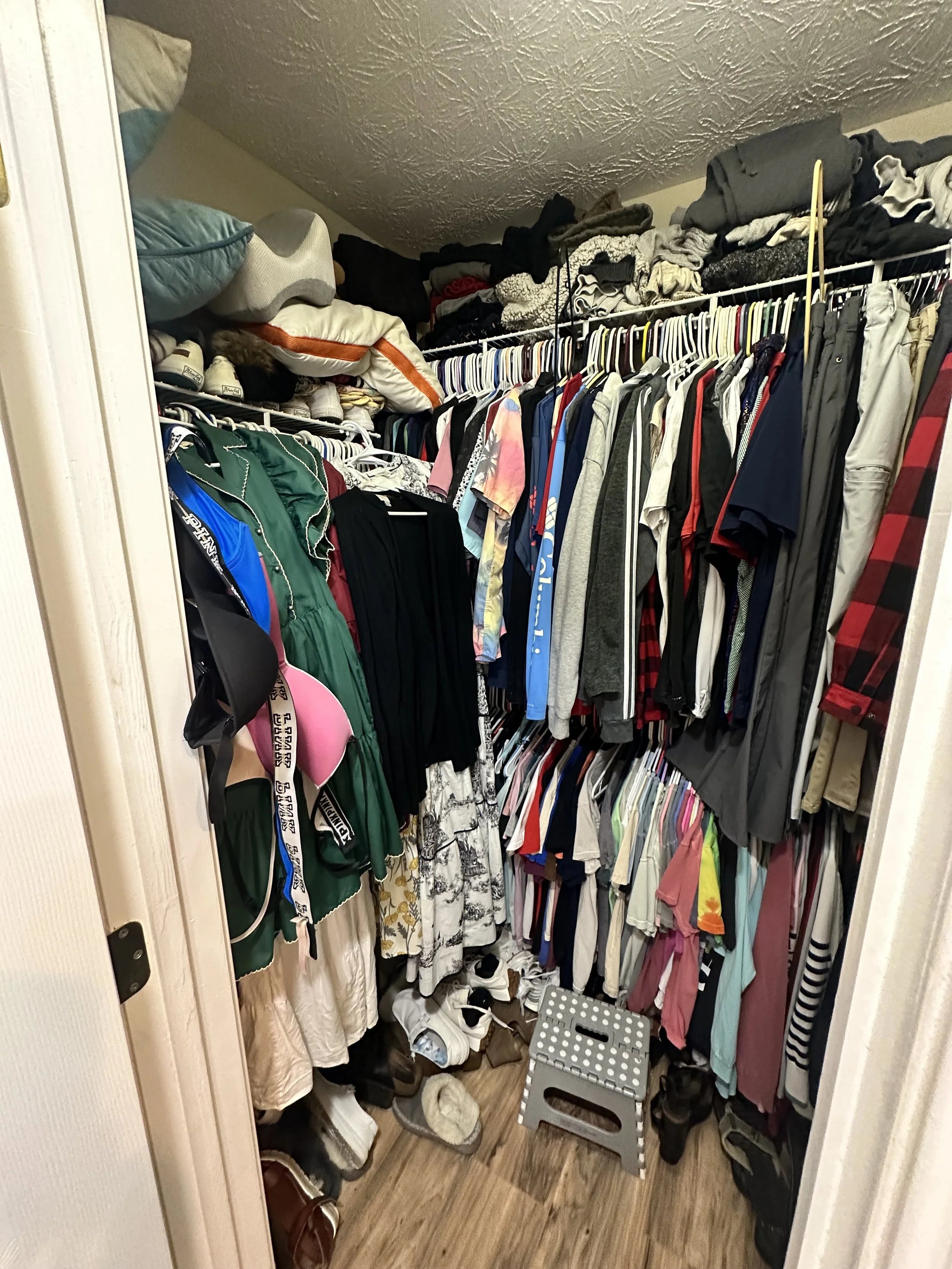 Cluttered walk-in closet with hanging clothes, folded items on top shelves, shoes on the floor, and a small step stool.
